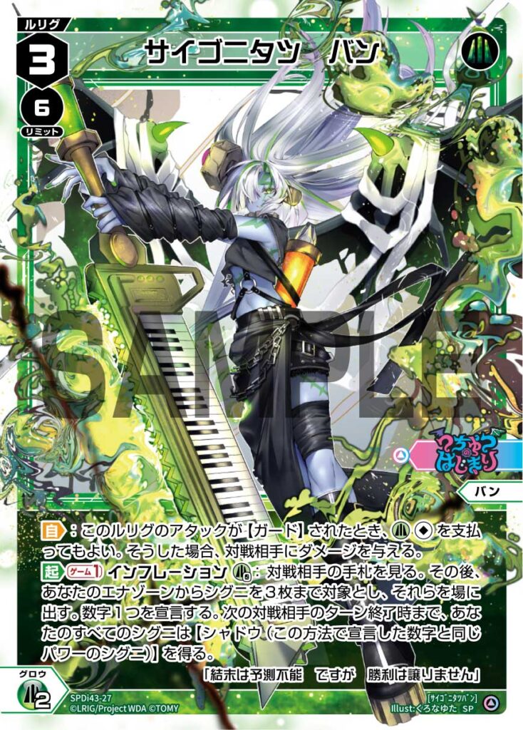「DIVAルリグパック No Limit&うちゅうのはじまり」では新たなセンタールリグ《サイゴニタツ バン》が登場。非常に攻撃的なルリグアタックを持つ緑ルリグ。