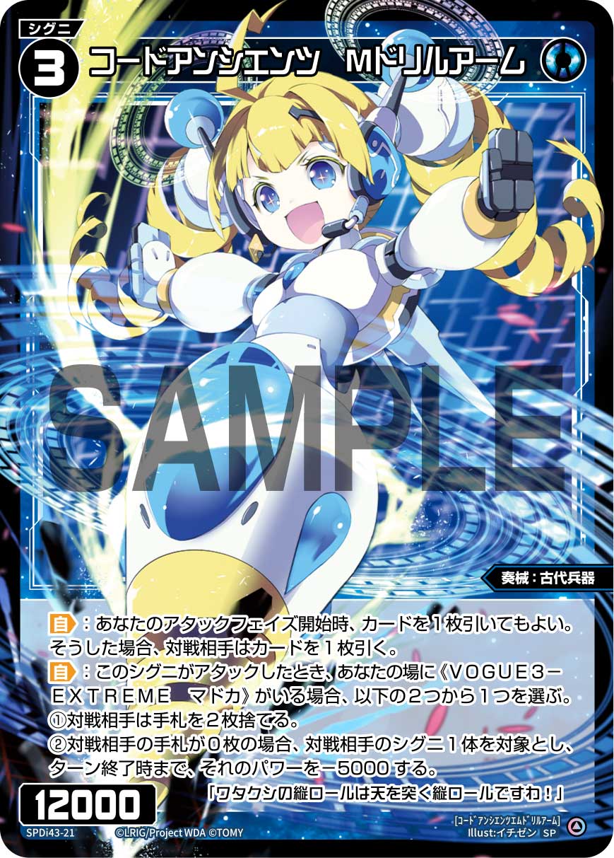アタックした時の能力は2つ。2ハンデスか、相手の手札が0枚であれば、相手のシグニ1体のパワーをマイナス5000できる。2ハンデスは《参ノ遊姫 フンスイショー》に並ぶ優秀な能力で、マイナス5000もノーコストゆえシンプルに便利だ。パワーの高いシグニはマドカの自動能力でバニッシュし、パワーの低いシグニを《Mドリルアーム》で溶かすといいだろう。何であれ、相手の手札は早々に0枚にしたい。